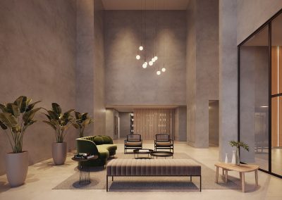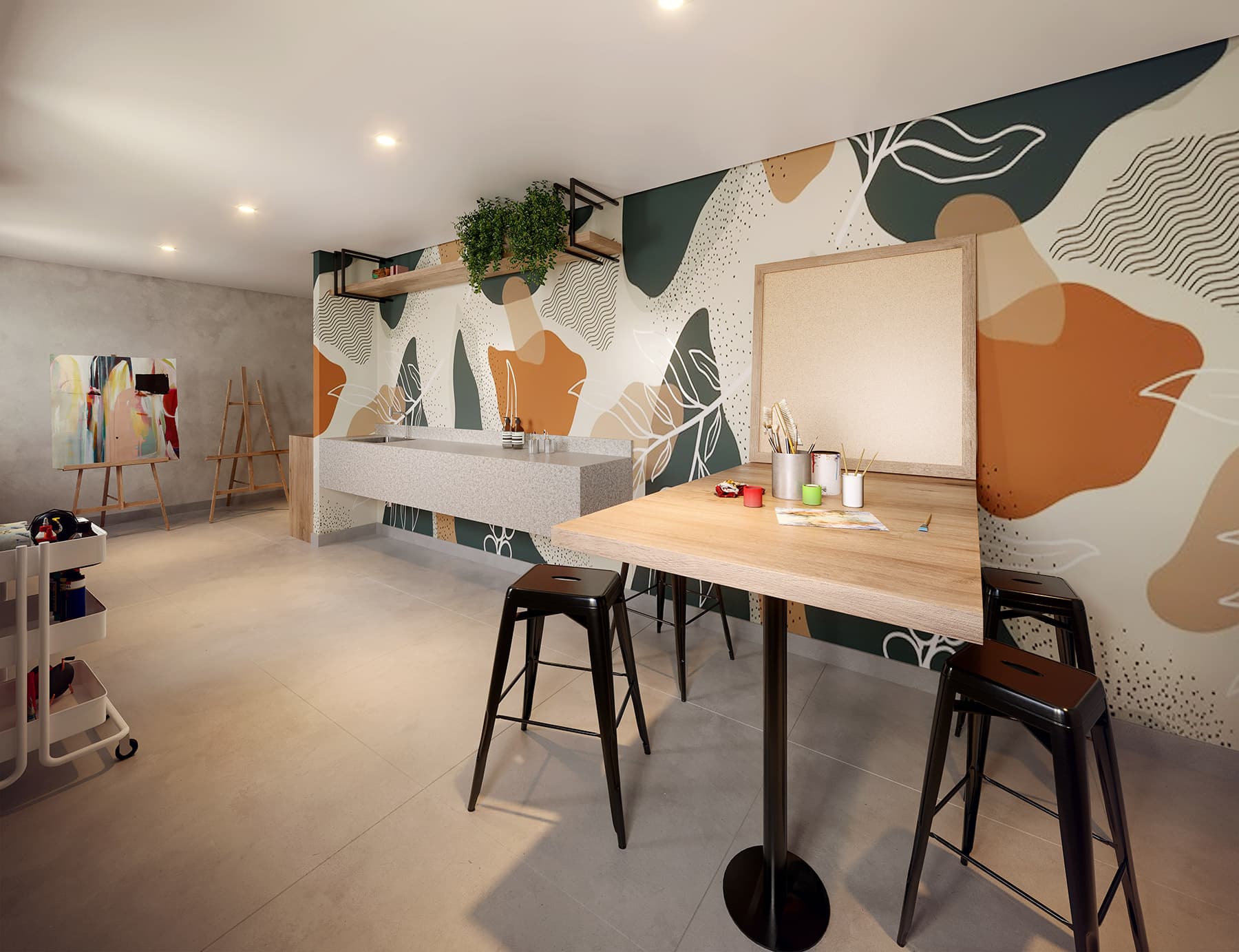 Ilustração artística da planta dos apartamentos finais 1, 2, 6 e 7 de 39,54m² privativos. Todos os móveis, objetos, pisos, rodapés, molduras, sancas e alguns pontos de iluminação estão dentro dos parâmetros comerciais e servem somente como sugestões de decoração, não integrando o imóvel comercializado. Todos os detalhamentos de equipamentos e acabamentos que farão parte deste empreendimento constam no memorial descritivo. *Janela com persiana de enrolar metálica integrada nos dormitórios.